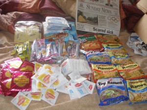 My loot – iced tea bags, lemonade mix, ramen noodles, coffee singles, the Sunday paper, and two bottles of bodywash (not pictured)