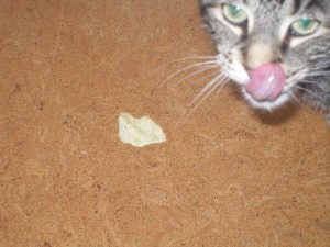 Hobbes, licking his lips after licking the dill off a chip…he kept begging for one, and Sarah told me if he kept it up to give him one to see what he would do…he just licked off the dill and left the chip on the floor!